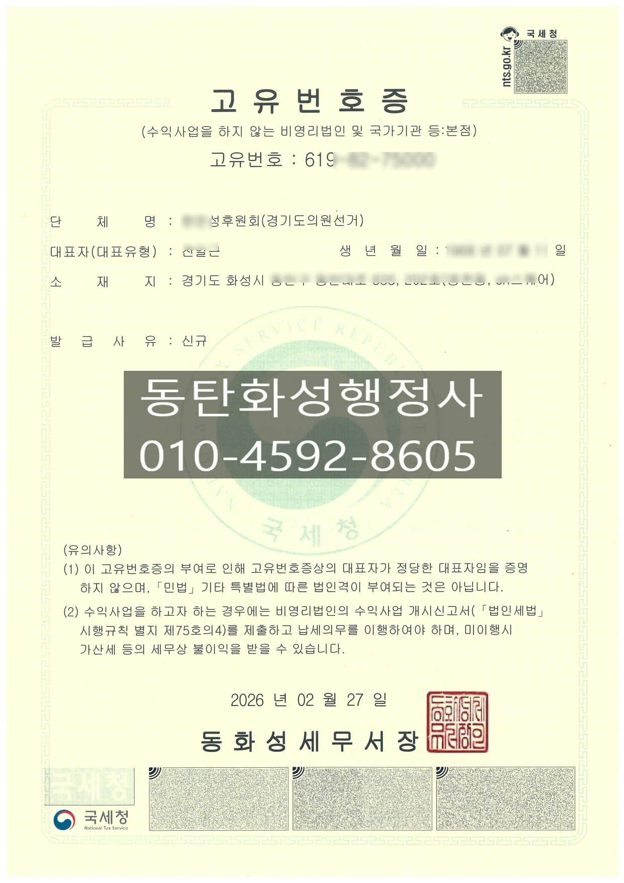 7) 관할 세무서에 고유번호증 발급 신청